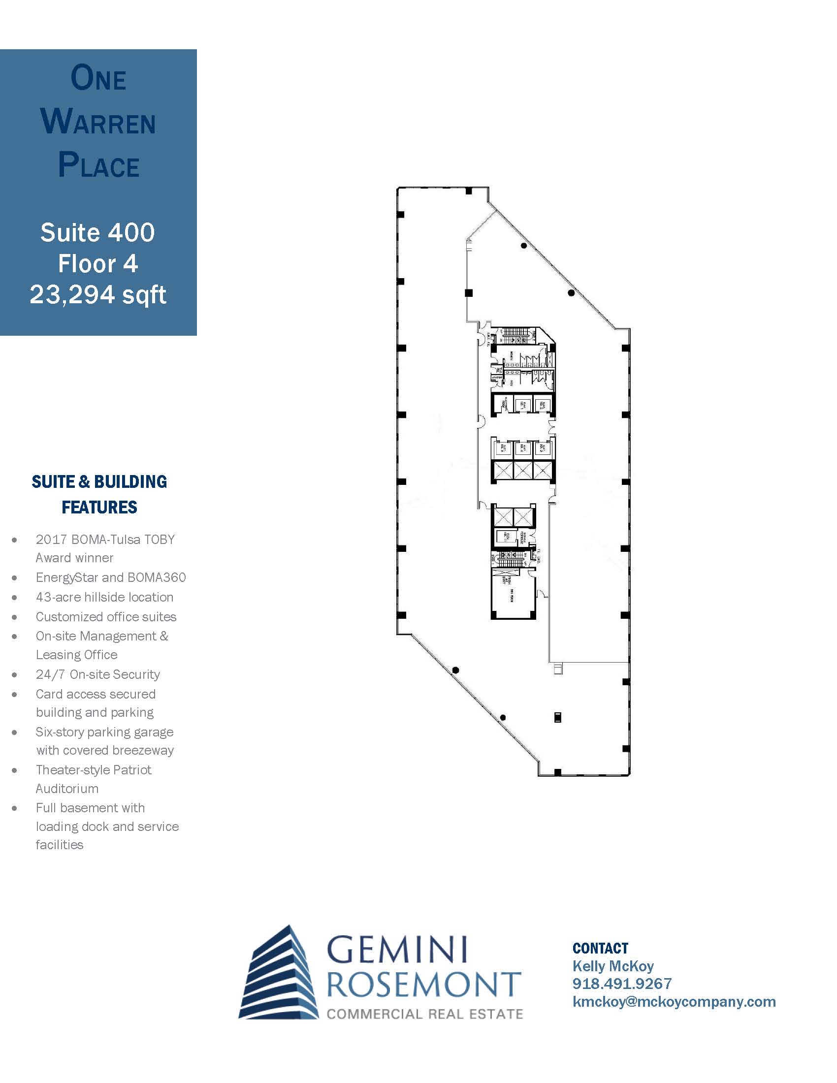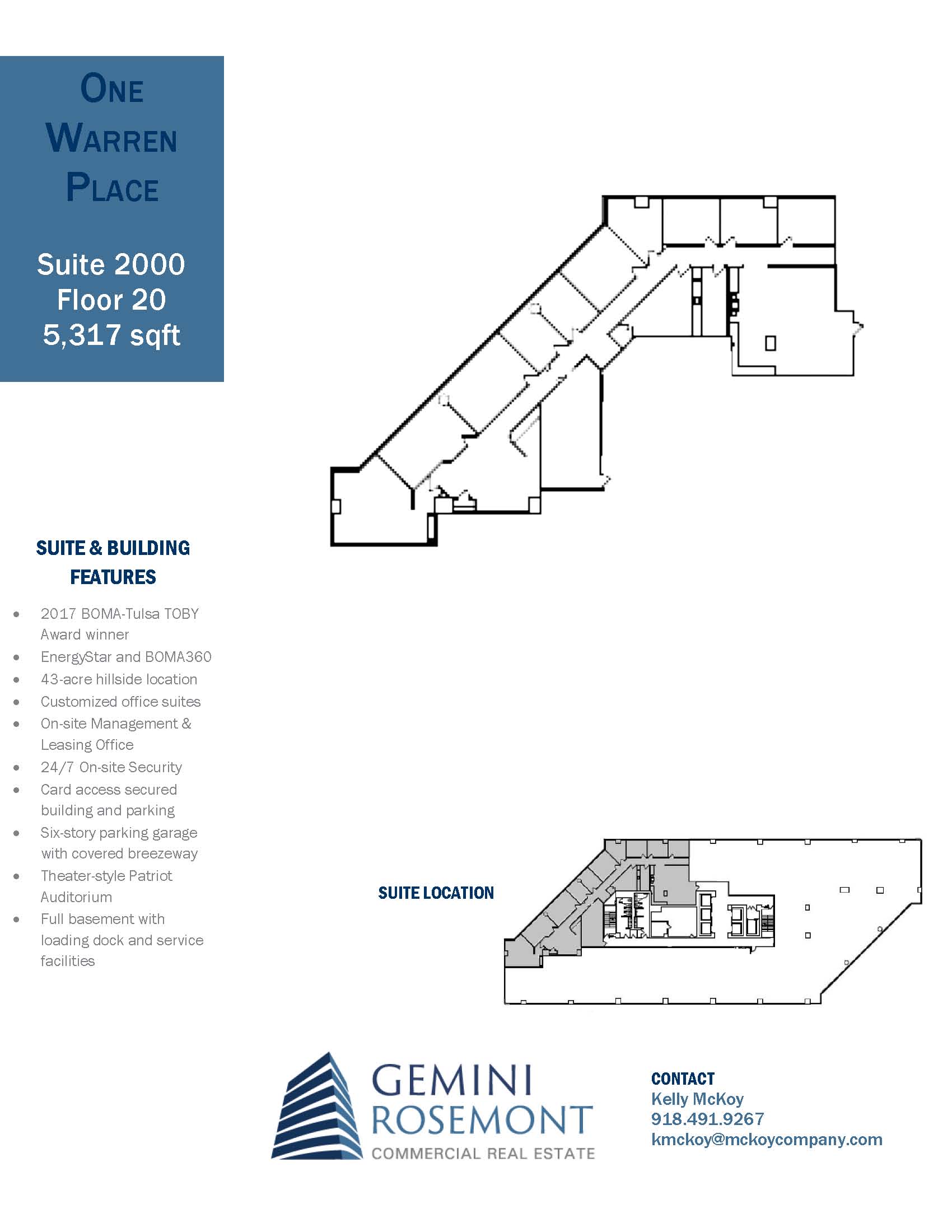 Situated on a picturesque 50-acre hillside, Tulsa's landmark office environment includes two award-winning Class A office towers and a highly-rated Doubletree Hotel. Warren Place is the ideal corporate address and features stunning architecture, luxurious landscaping, panoramic views and unparalleled amenities.